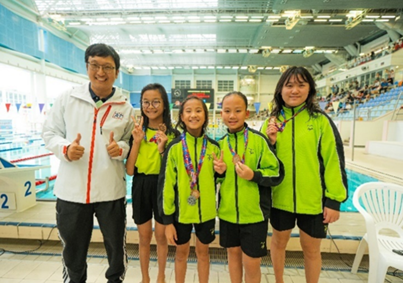 游泳課是本校體育課程的一大特色。每個學年,我校都會為三至六年級的學生安排五節游泳課,讓大家走出校園,進入泳池,享受不一樣的體育課。課堂採用小組教學模式,幫助學生初步掌握游泳技巧,並在輕鬆愉快的氛圍中,提升對游泳的興趣與自信。此外,課堂中的專業教練也會留意具有潛力的學生,邀請他們加入學校泳隊,於課後接受進一步培訓,持續發展所長,追求更卓越的表現。